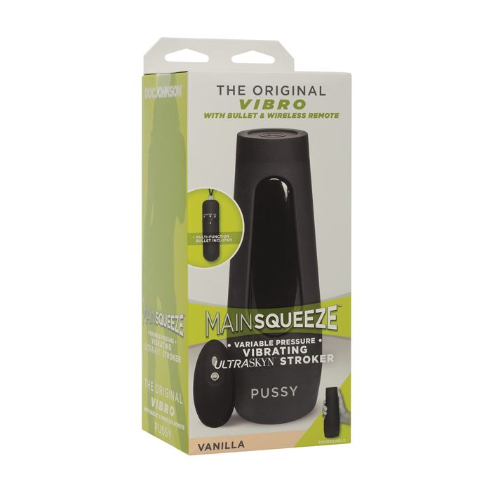 She’s always within reach. Vibro dials up the intensity with a powerful 9-function vibrating bullet that fits in a special self-contained pocket built into the ULTRASKYN™ insert and operates via the included wireless remote. Doc Johnson’s Main Squeeze line of hard case masturbators is designed to put the power in your hands, featuring a squeezable grip that lets you vary the tightness of each stroke and a suction-adjusting end cap. Featuring a perfect lifelike pussy opening, this ULTRASKYN™ stroker looks and feels real and is whoever you want her to be. Vibro’s vibrating bullet only needs to be removed to power off its battery for storage, and each ULTRASKYN™ sleeve features a different textured interior to make every experience as unique as the real thing. The double-cap hardshell design doubles as a discreet travel and storage case, keeping your Main Squeeze fresh and ready for whenever the mood strikes.