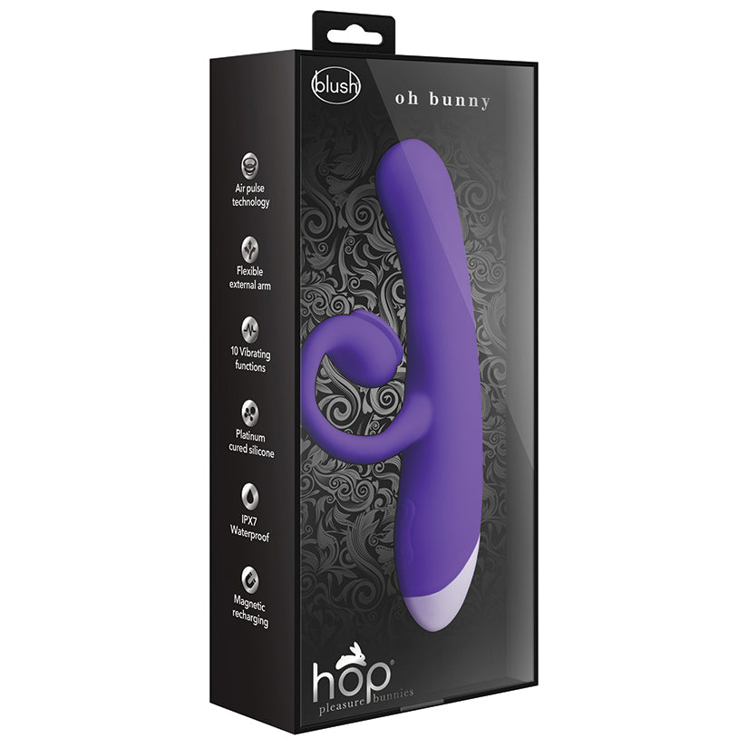 Seductively powerful, the Hop Oh Bunny brings new air pulsation technology to a traditional rabbit design. The Oh Bunny features 10 functions and a flexible clitoral arm that bends for perfect positioning around the clitoris. The 10 powerful vibrating functions and 10 air pulse functions can be controlled independently. The UltraSilk™ Silicone is silky smooth and delivers vibrations beautifully.